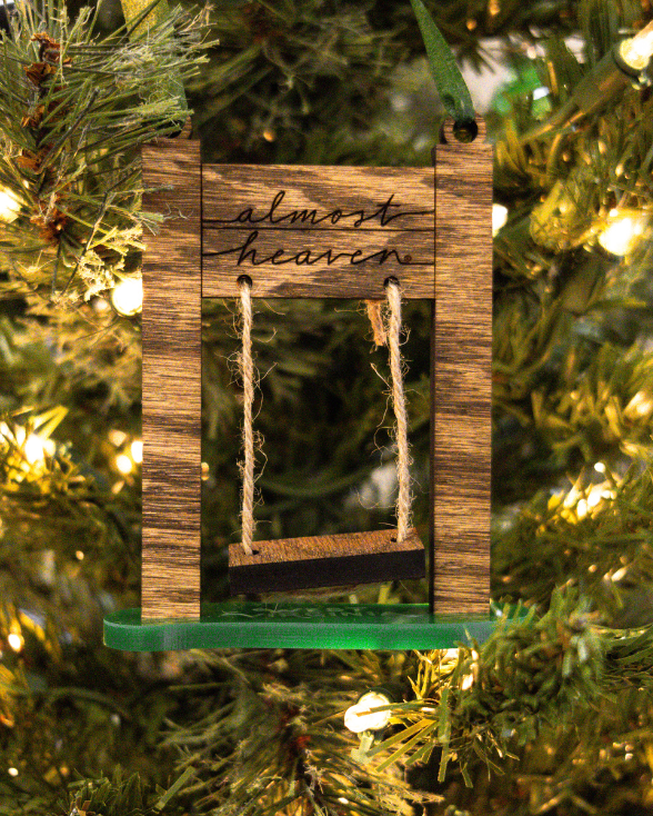 Honor your West Virginia heritage with this beautifully crafted ornament. The stained oak wood swing is paired with a vibrant green acrylic base, creating a striking keepsake that captures the essence of home. Pre-engraved with the iconic West Virginia swing logo, it arrives ready to treasure or gift. At 4.5 inches tall and weighing just 1.5 ounces, it's perfectly sized for tree branches, shelves, or display stands. This meaningful piece celebrates your roots and brings warmth to your holiday season, making it a cherished addition to your collection year after year.