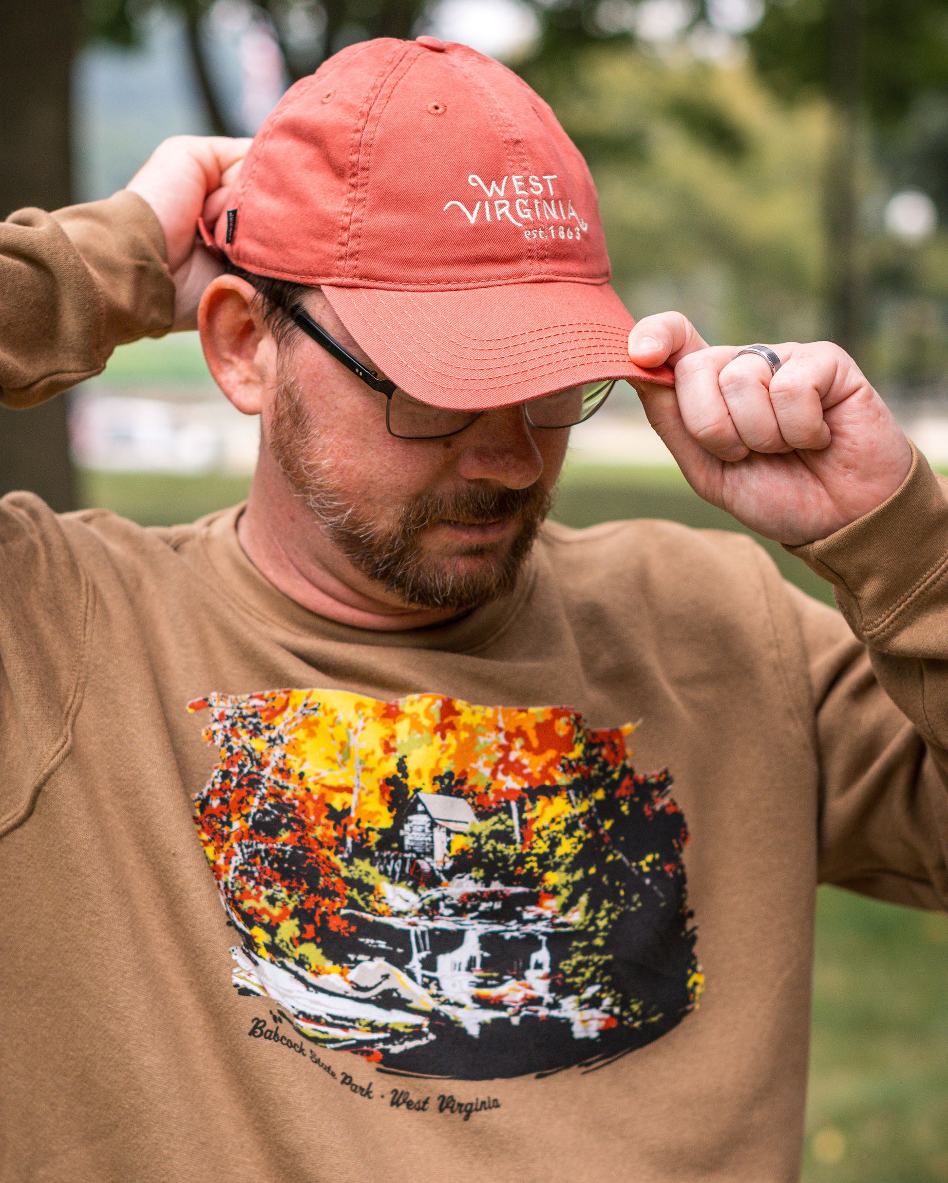 Stay cozy with this Babcock State Park crewneck, featuring a painted-style design of the park's iconic grist mill surrounded by vibrant nature. Soft and durable, it’s perfect for crisp mornings or showcasing your love of West Virginia's beauty.