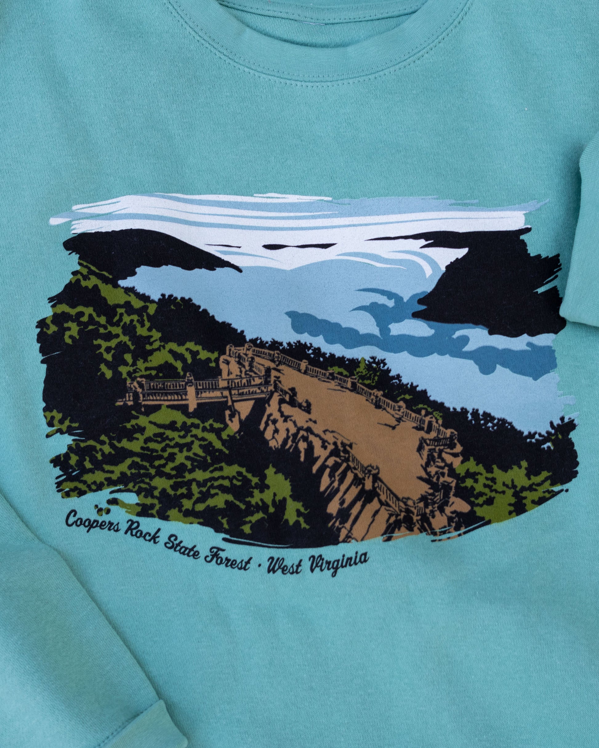 Perfect for nature lovers and West Virginia explorers, this sweatshirt stylishly displays your appreciation for the wild. Featuring a painted-style design of Coopers Rock’s iconic overlook, it captures the rugged cliffs and rolling landscapes.