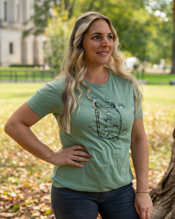Light up your summer nights with the Glow of the Mountains Women’s Tee! Featuring a whimsical firefly jar design that glows in the dark, this West Virginia State Parks shirt brings back the magic of chasing fireflies under mountain skies. Soft, stylish, and full of adventure-ready charm—just like a night in the parks.